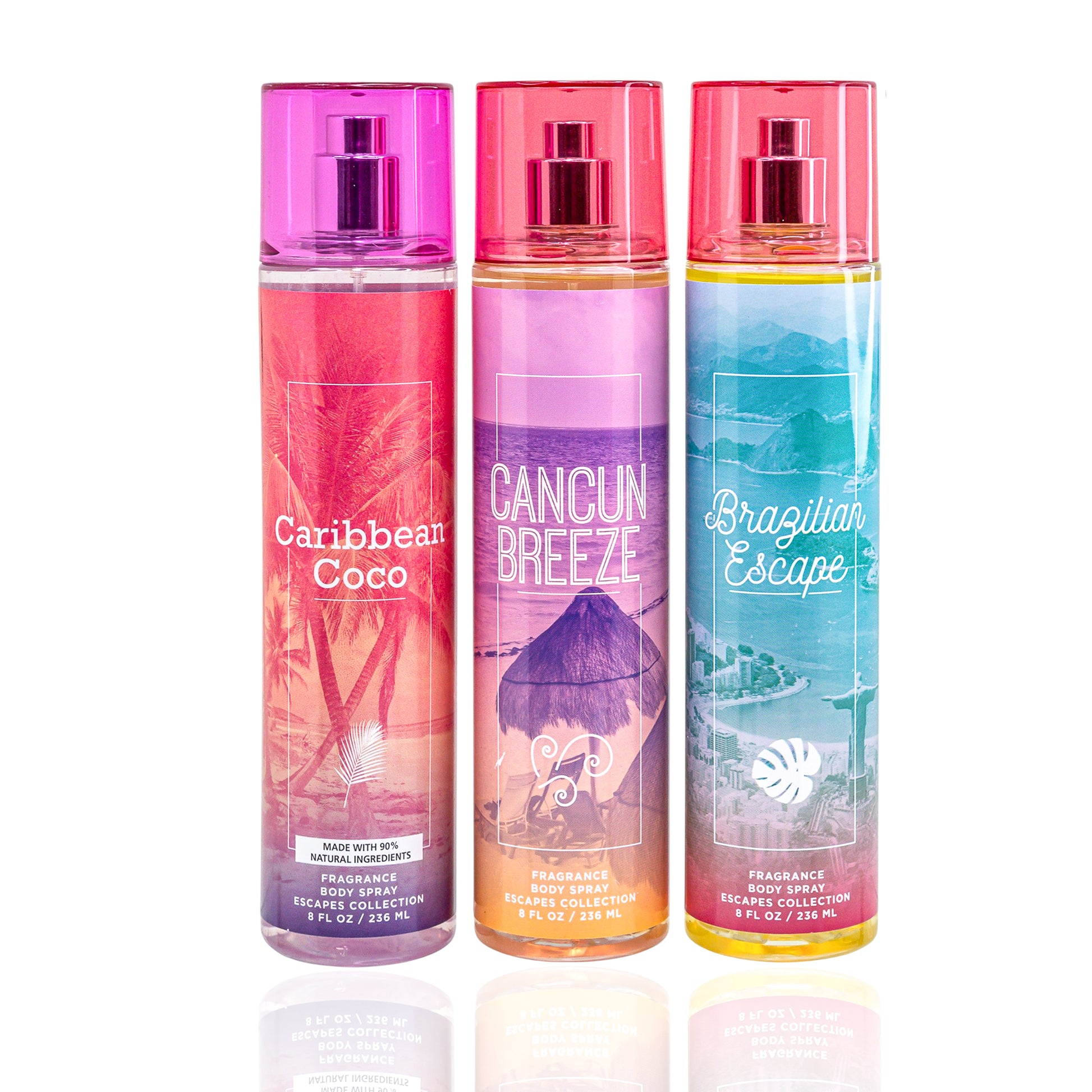 Each mist captures the tropical spirit of its destination. Cancun Breeze offers a refreshing blend of sparkling citrus, coconut, and palm leaves, evoking the vibrant energy of Cancun. Brazilian Escape brings the rich, intoxicating scent of Brazilian rainforest with notes of passionfruit, jasmine, and lush greenery. Malibu Pina transports you to the breezy beaches of Malibu with a fun, playful blend of pineapple, coconut milk, and warm vanilla.